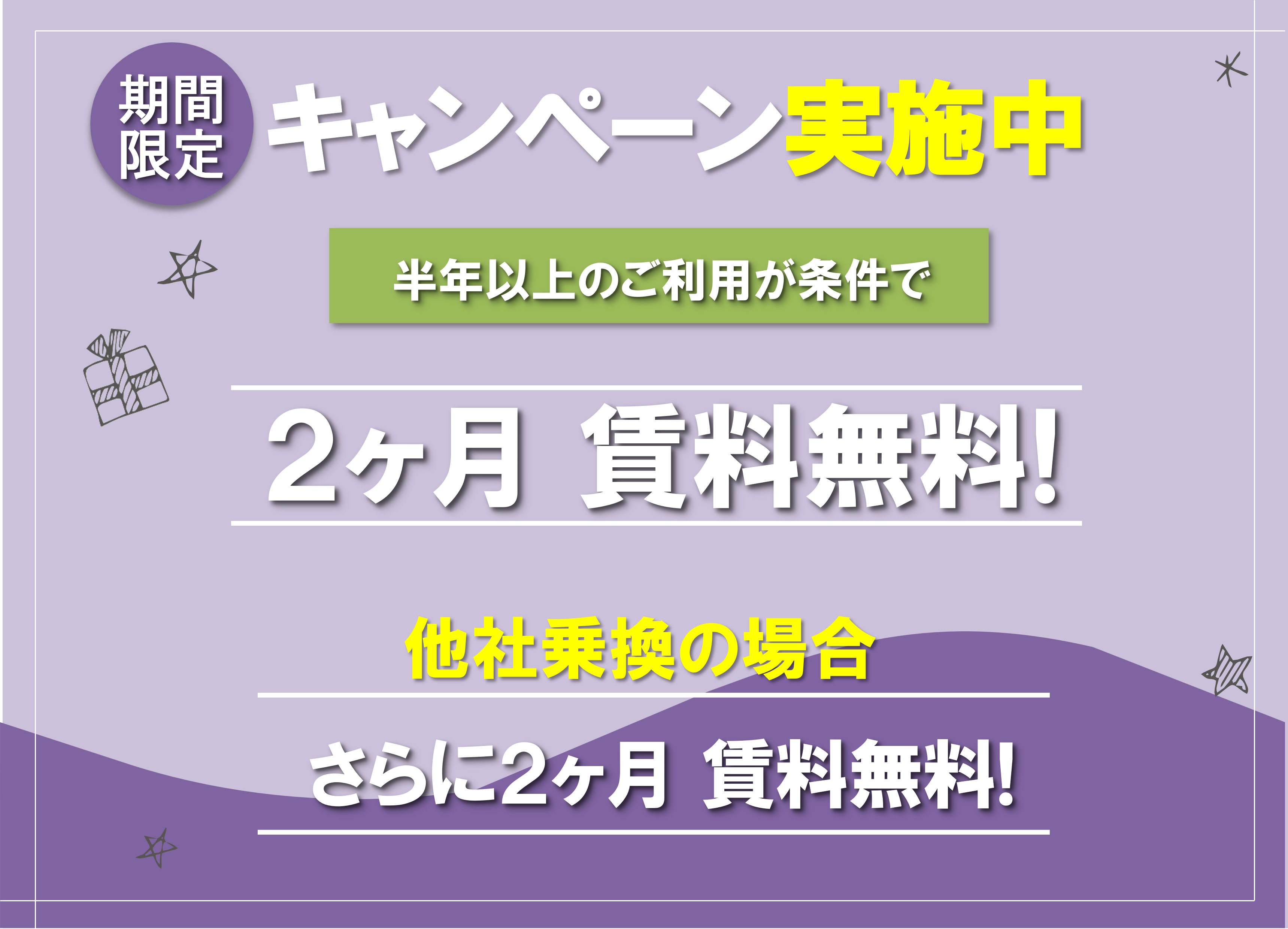※キャンペーンを行っている店舗では、ご利用期間が一定以上ある場合にキャンペーンが適用されます。キャンペーン期間に満たないご契約の場合は対象外となりますので、ご了承ください。